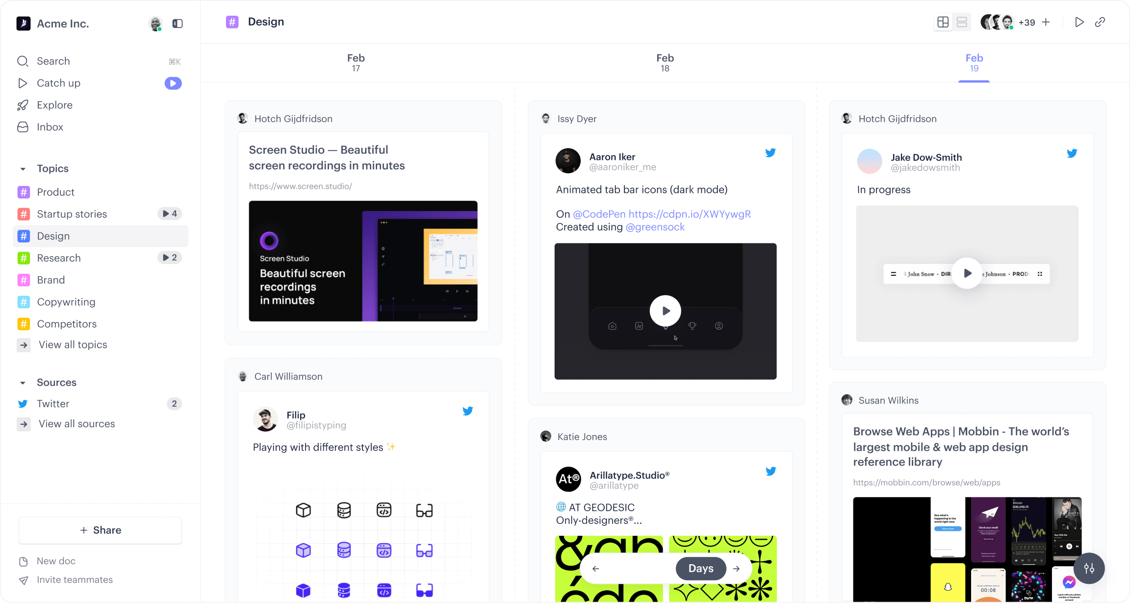 Get up to speed with your team’s work-in-progress and all the inspiring content they discover across the web.
